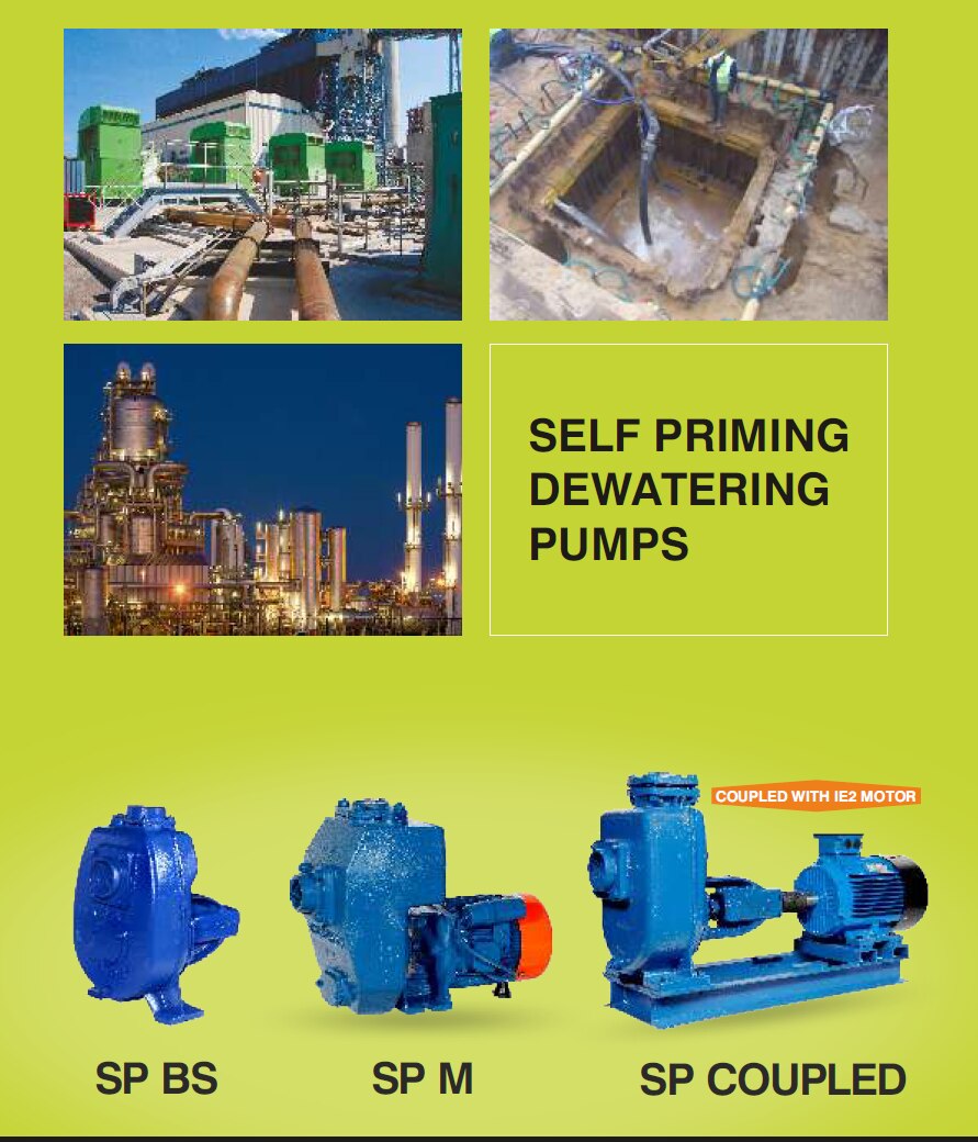 APPLICATIONS Handling Chemicals, Effluents, Sewage and Ash-Water De-Watering Foundation, Trenches and Pits Flood Water Handling Pumping Water from Docks, Ports, Vessels Dewatering from Basements, Multi-storeys, Shopping Malls, Godowns, etc. Cooling Water for Marine Engines and Shovels SPECIFICATIONS Head range: Up to 44 metres Discharge Range: Up to 80 LPS Power Rating: 0.75 - 18.7 kW & (1 - 25 HP) motor coupled Voltage Range: 415±10% Class of insulation: F class (motor coupled only) Protection: IP 55 MATERIAL OF CONSTRUCTION Impeller: Cast Iron/Stainless Steel/Bronze Motor Body: N/A Delivery Casing: Cast Iron Shaft: Carbon Steel/Stainless Steel Shaft Sleeve: Stainless Steel Sealing: Gland Packed/Mechanical Seal FEATURES Self-priming Non-clog impeller Flatter Efficiency Curve Designed to Prevent Overloading Dynamically Balanced Rotating Parts Replaceable Wearing Parts CED – Cathode Electro Deposition Coating Easy Maintainable Design